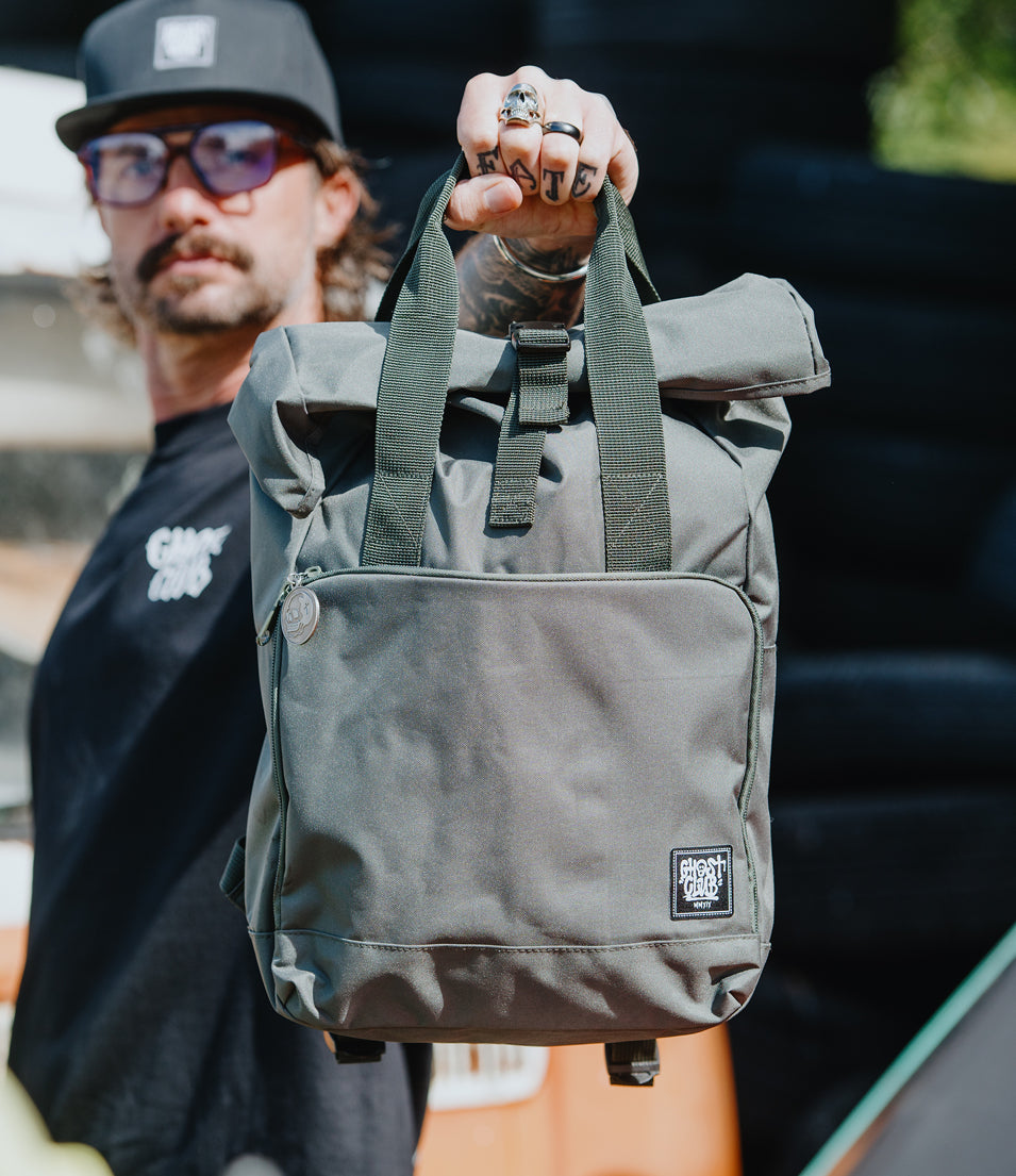 The Staple Roll-Top Backpack complete with custom 'Skully' zipper. Available in 3 colours.